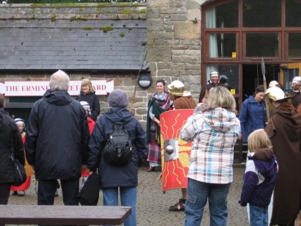 Jacquie and I were watching the demonstration in the courtyard and a few girls with huge backpacks came up to us and we got chatting. They were camping and aimed to finish the path in 5 days W-E. They told us that the Centurion Inn in Walton where we were planning on stopping for lunch had closed down, and we told them that the shop in Gilsland where they planned to buy supplies was closed due to the Bank Holiday.